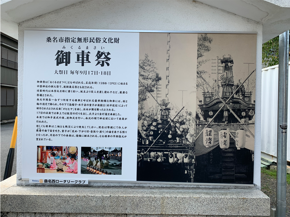 戦災で焼失したが、拝殿は昭和29(1954)年、楼門は平 成7(1995)年に再建された。戦時中に社宝は疎開していたので、桑名の名工・千子村正の刀剣●など、今も多く残っている。境内に山口誓子の句碑、千葉兎月の句碑などがある。