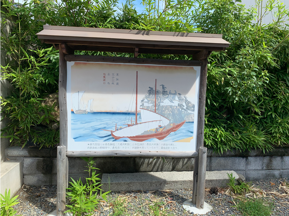 東海道に面して建っている「春日神社青銅鳥居」●は寛文7(1677)年に桑名の鋳物師・辻内氏によって建立され、その後3度倒壊したが、その都度辻内氏の子孫によって修復されている。最近では昭和34(1959)年の伊勢湾台風で倒壊して修復されたが、その旨が柱に刻まれている。鳥居の傍らに建っている「しるべ石」は明治18(1885)年に桑名出身で東京で材木商をしている蘆田政治によって建立された。行方不明の人を探す伝言板である。同じものが多度大社にもあり、人出の多い場所に建てられた。